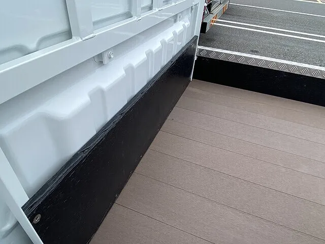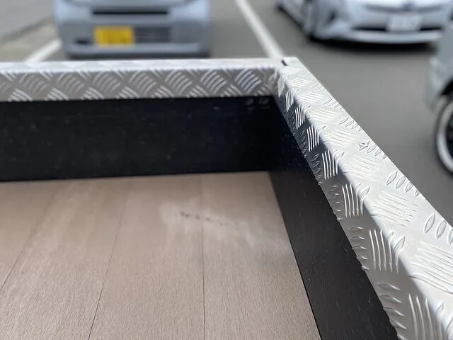 あおり枠プロテクターをアルミの縞板にて製作。荷台床板はアピトン材を使用しました。